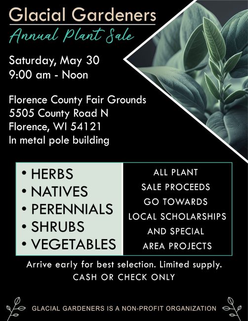 It is that time of year again. Mark your calendars for the Glacial Gardeners Annual Plant Sale being held on Saturday, May 30, 2026, from 9AM – Noon at the Florence County Fair Grounds.